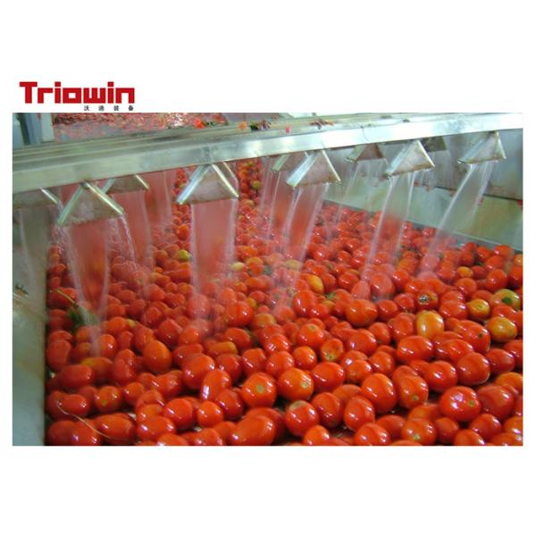 Tomatoes are usually processed for paste and the processing line mainly includes five parts: fresh tomato receiving, pre-washing and sorting section; extracting section; concentrating section; pasteurizing or sterilizing section; aseptic filling section. It is mainly composed of discharge system, hydraulic convey system, bucket elevating, washing and sorting system, crushing system, pre-heating system, pulping and refining system, evaporating& concentrating system, sterilizing system, aseptic filling system. Tomato paste in aseptic drum can be further processed to ketchup, sauces, juices in tin can/bottle/pouch, etc.